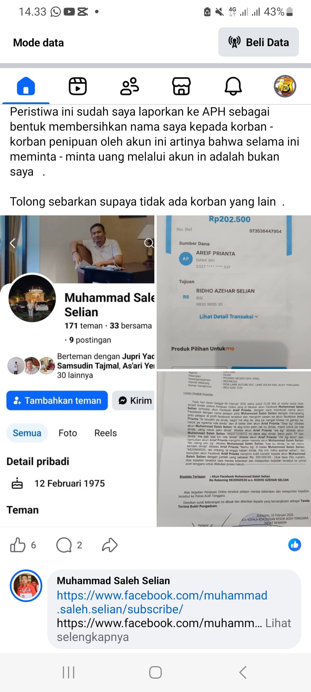 Aceh Tenggara – news1kabar.com ksi penipuan bermodus pencatutan identitas kembali terjadi di media sosial. Sebuah akun Facebook palsu menggunakan foto dan nama Muhammad Saleh Selian untuk meminta uang kepada sejumlah orang.