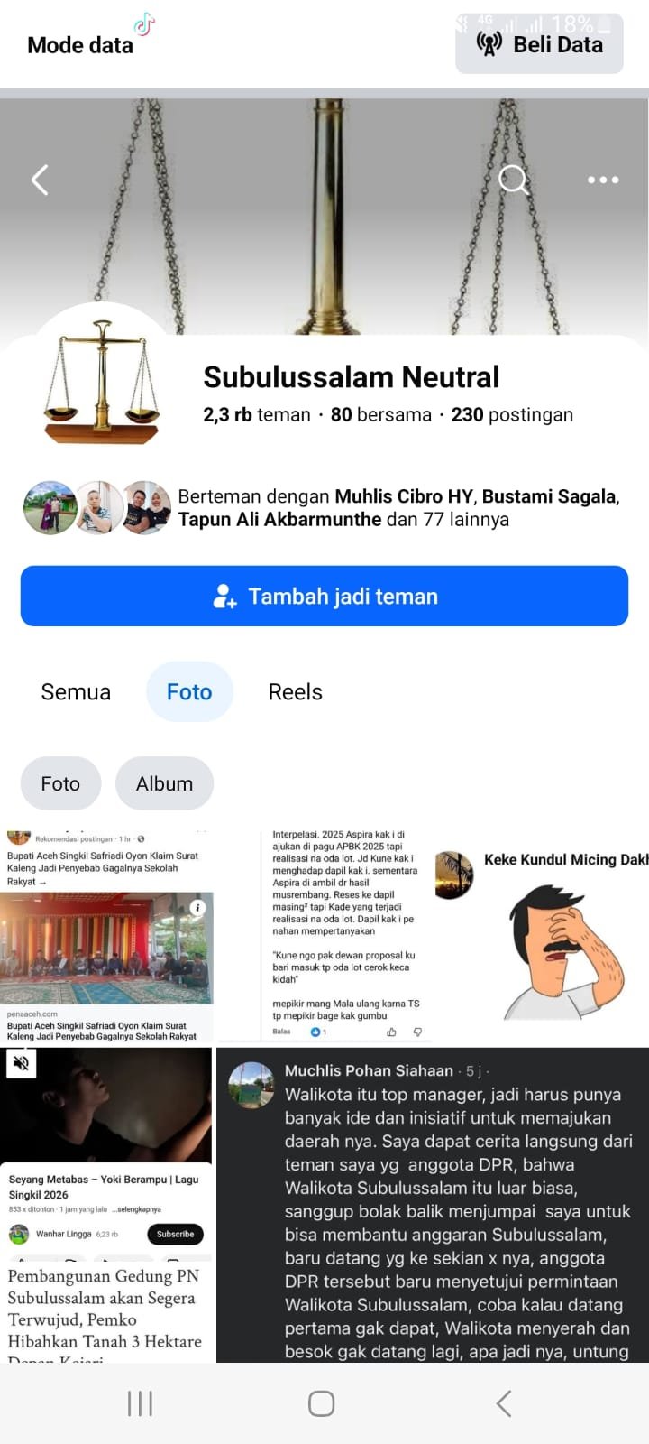 Subulussalam| news1kabar.com  Keberadaan akun Facebook bernama “Subulussalam Neutral”menuai sorotan dan keresahan di tengah masyarakat. Akun yang diduga anonim atau bodong tersebut dinilai kerap memposting konten bernada provokatif, ujaran kebencian, serta makian terhadap sejumlah pihak di Kota Subulussalam.