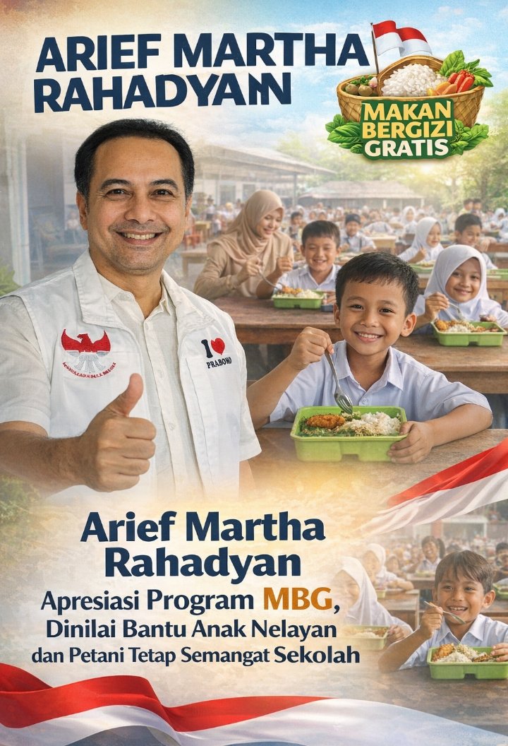Tokoh muda nasional Arief Martha Rahadyan menilai Program Makan Bergizi Gratis (MBG) yang digagas pemerintah menjadi langkah nyata negara dalam memastikan anak-anak Indonesia mendapatkan asupan gizi yang layak sekaligus meningkatkan semangat belajar di sekolah.