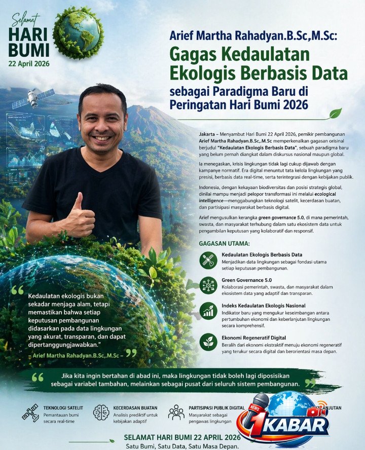 Momentum Hari Bumi pada 22 April 2026 dimaknai secara berbeda oleh Arief Martha Rahadyan. Dalam sebuah pernyataan strategis, Arief Martha Rahadyan memperkenalkan konsep baru bertajuk “Kedaulatan Ekologis Berbasis Data”, sebuah pendekatan yang belum banyak diangkat dalam diskursus nasional maupun global.