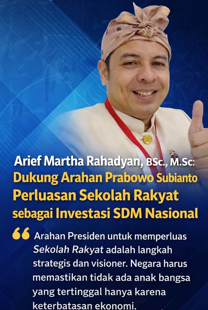 Arahan Presiden untuk memperluas Sekolah Rakyat adalah langkah strategis dan visioner. Pendidikan merupakan fondasi utama dalam membangun bangsa yang kuat dan berdaya saing. Negara harus memastikan bahwa tidak ada anak bangsa yang tertinggal hanya karena keterbatasan ekonomi,” ujar Arief