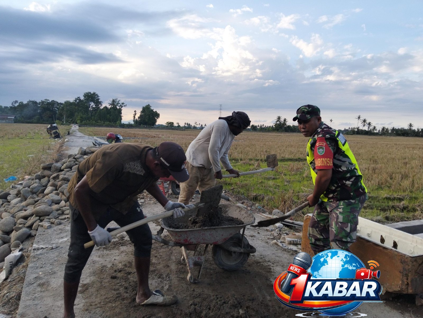 Pidie Jaya, 21 April 2026 – Babinsa Koramil 11/Bandar Baru, Kodim 0102/Pidie, Serda Ismet Metni Siregar melaksanakan kegiatan gotong royong bersama masyarakat Desa Blang Glong, Kecamatan Bandar Baru, Kabupaten Pidie Jaya. Kegiatan ini difokuskan pada pembangunan jalan desa serta pengairan sawah guna mendukung kelancaran aktivitas pertanian warga.