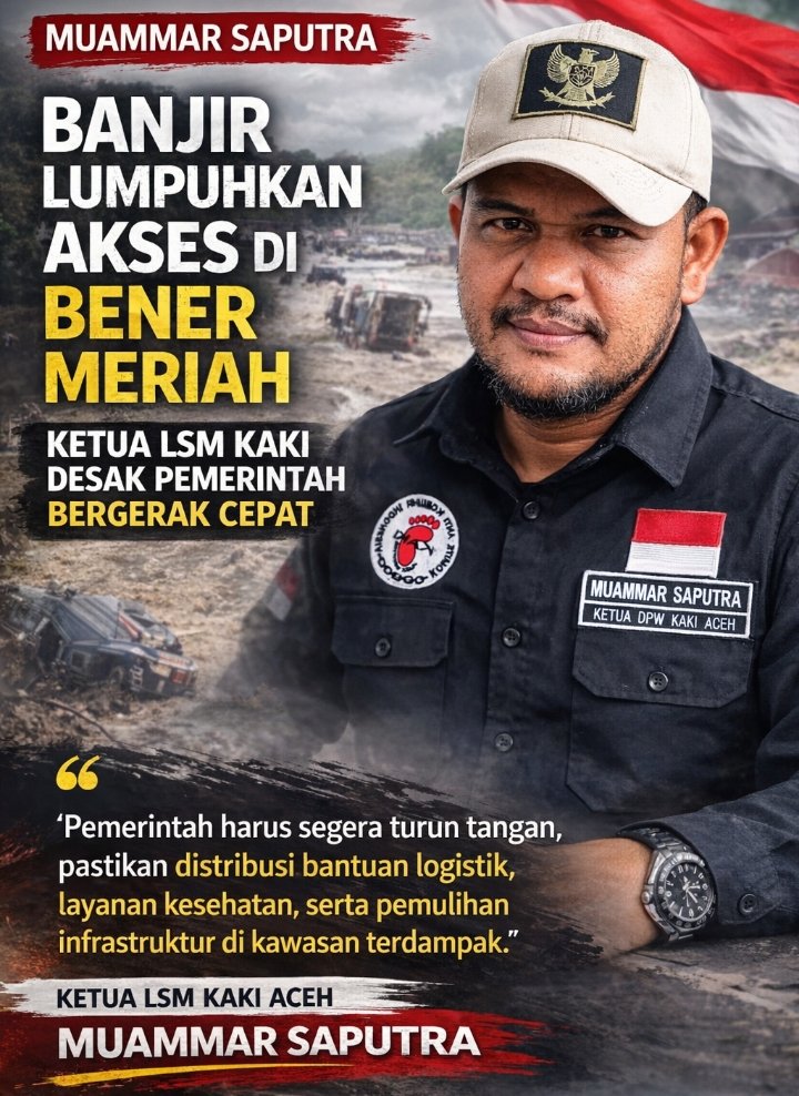 Ketua LSM KAKI Aceh, Muammar Saputra, mendesak pemerintah daerah maupun pusat untuk segera mengambil langkah cepat dan terukur dalam penanganan bencana serta penyaluran bantuan kepada masyarakat terdampak.