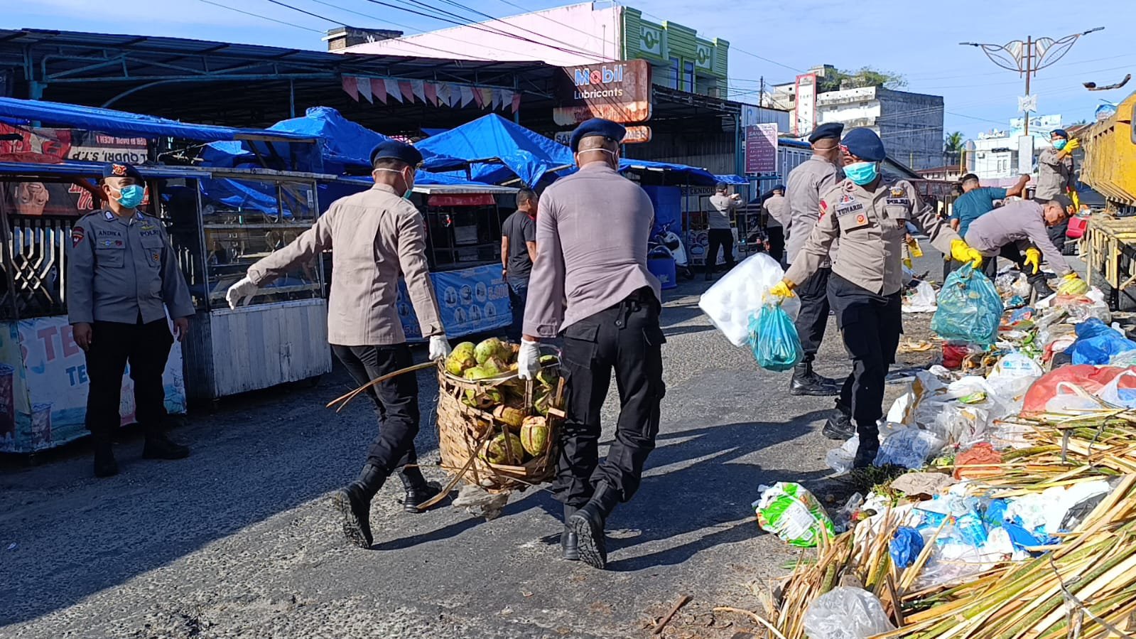 Dengan semangat Gotong royong, Personel Gabungan dan petugas kebersihan bahu membahu membersihkan dan mengangkut sampah sisa-sisa makanan dan sampah plastik
