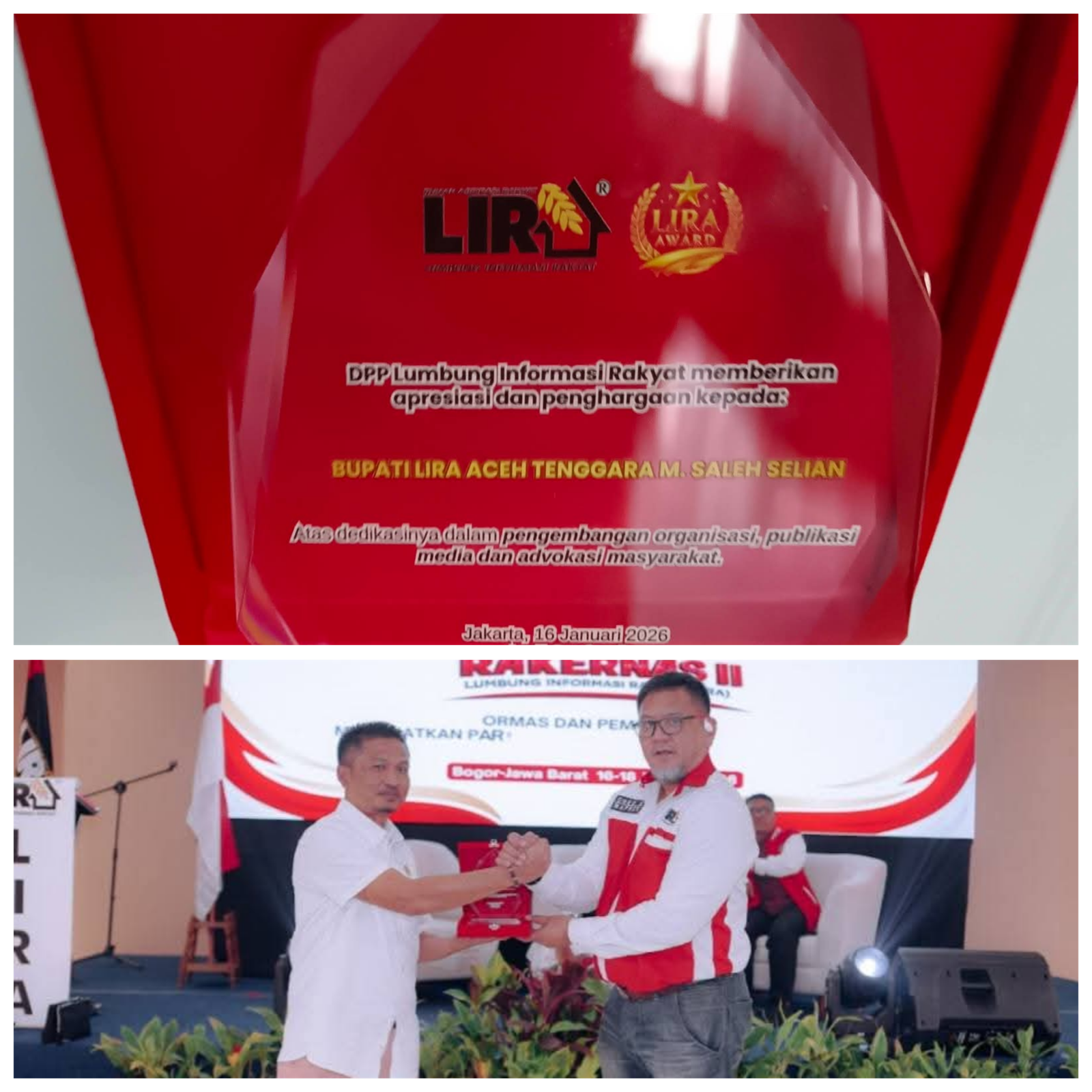 Bogor, Jawa Barat—news1kabar.com Dewan Pimpinan Pusat (DPP) Lumbung Informasi Rakyat (LIRA) memberikan LIRA Award kepada Bupati LIRA Aceh Tenggara, M. Saleh Selian, sebagai bentuk apresiasi atas dedikasi dan kontribusinya dalam pengembangan organisasi, penguatan publikasi media, serta konsistensi dalam advokasi kepentingan masyarakat.