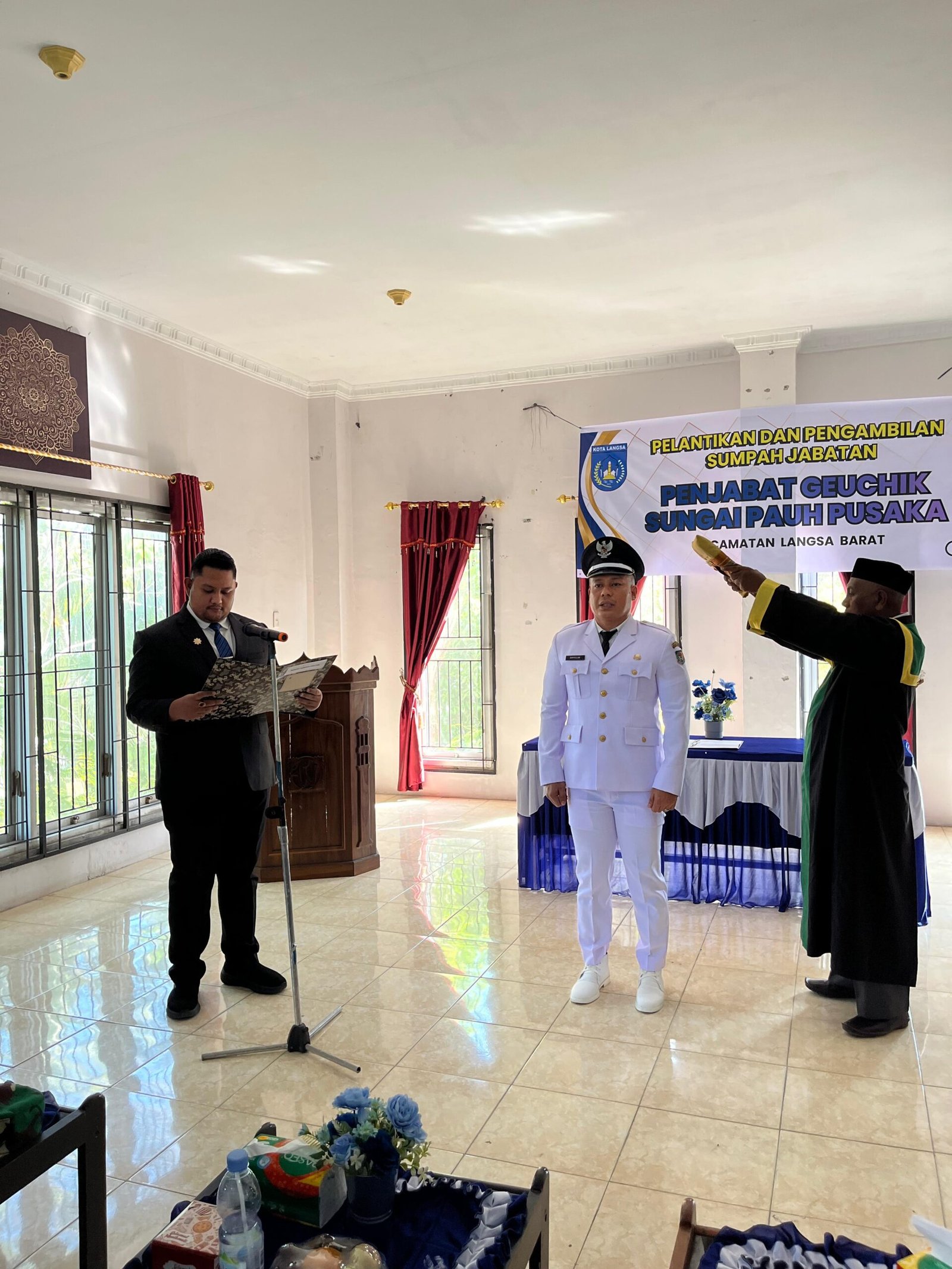 Pelantikan tersebut berdasarkan Keputusan Wali Kota Langsa Nomor: 147/141/2026 tentang Pemberhentian dan Pengangkatan Penjabat Geuchik Gampong Sungai Paoh Pusaka, Kecamatan Langsa Barat, Kota Langsa.