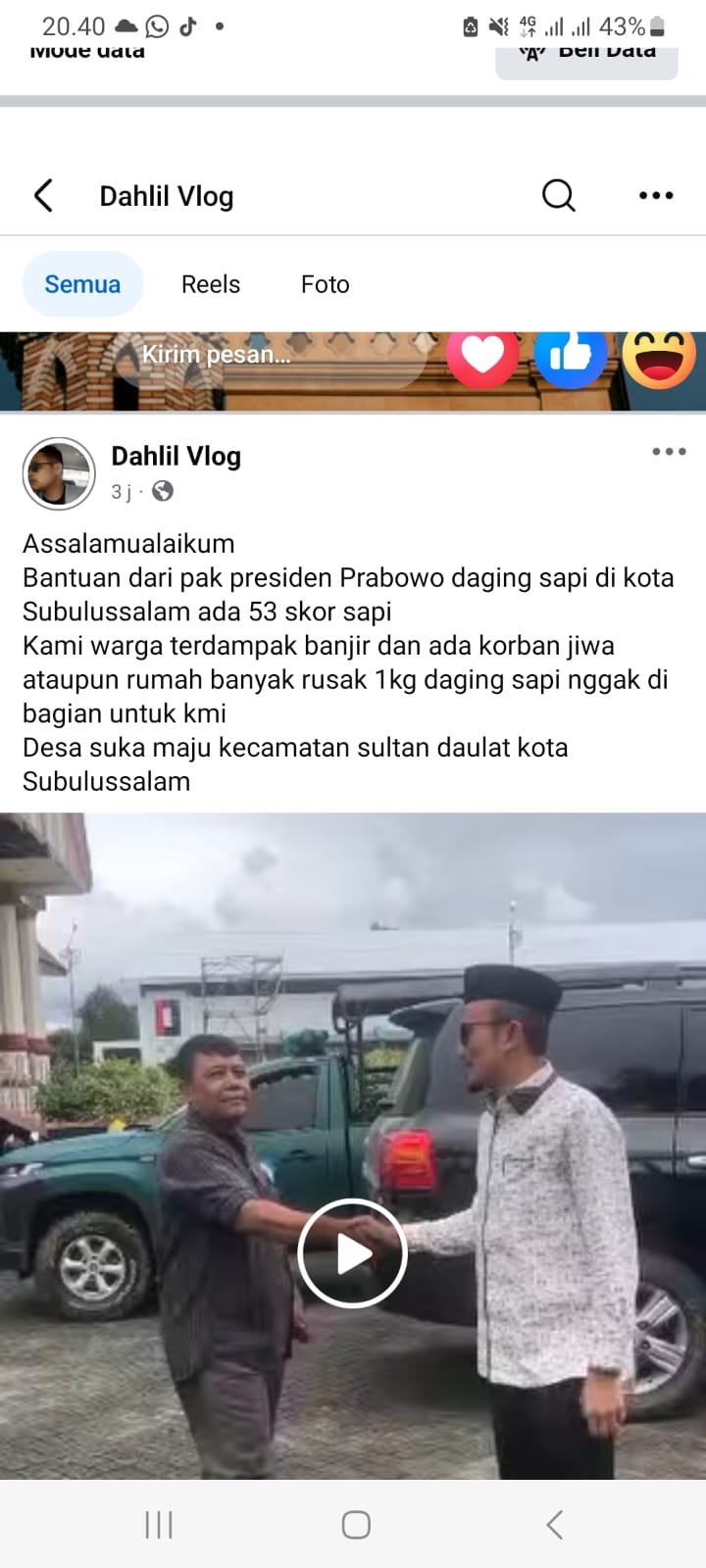 Subulussalam – news1kabar.com. Polemik pembagian daging sapi bantuan untuk korban banjir di Kota Subulussalam mendadak viral di media sosial. Bukannya mendapat apresiasi, program yang disebut-sebut sebagai bantuan kemanusiaan itu justru menuai kritik keras dari masyarakat.