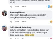 Sejumlah unggahan memperlihatkan potongan daging sapi dalam jumlah besar yang diklaim sebagai bantuan bagi warga terdampak banjir. Namun di kolom komentar, banyak warga mengaku belum menerima bantuan tersebut meski merasa menjadi korban banjir yang terdampak cukup parah.