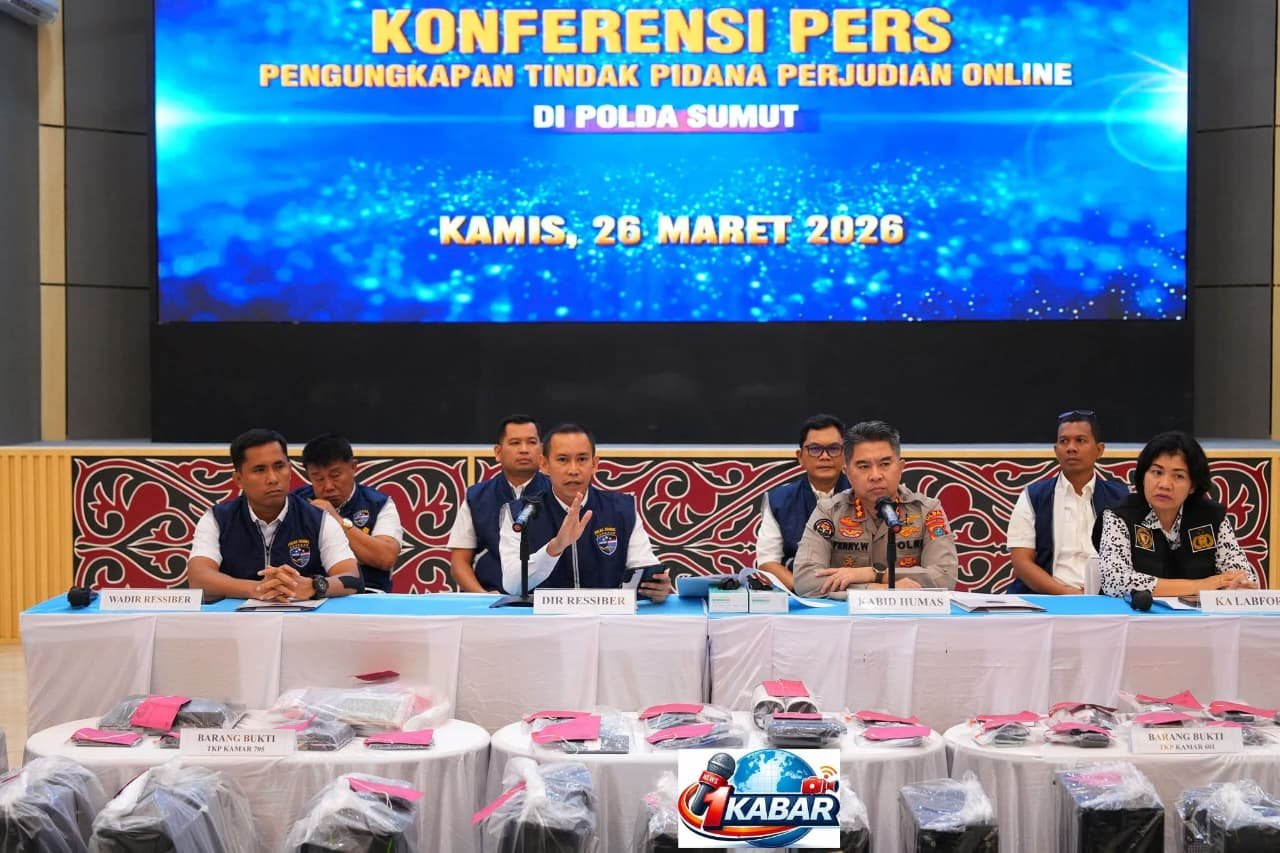 Kasus tersebut dipaparkan oleh Dirresiber Polda Sumut, Kombes Pol Dr. Bayu Wicaksono dalam konferensi pers yang dibuka Kabid Humas Polda Sumut, Kombes Pol. Ferry Walintukan di Aula Tribrata Polda Sumatera Utara, Kamis (26/03/2026).