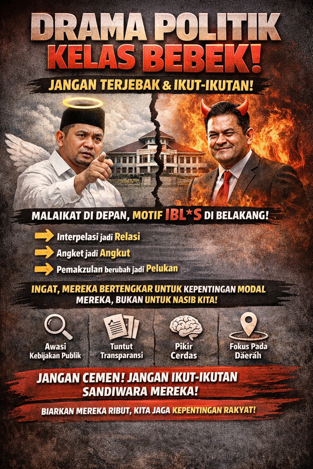 Politik memang ruang kompetisi. Perbedaan sikap antara eksekutif dan legislatif adalah hal wajar dalam demokrasi. Namun ketika konflik lebih menyerupai sandiwara yang penuh simbol dan ancaman, publik harus cerdas membaca situasi.