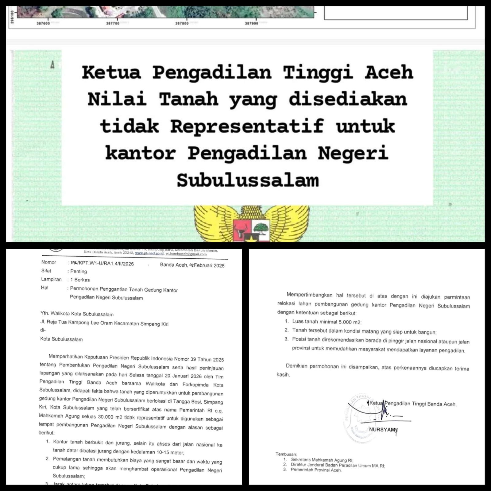Surat resmi bernomor 396/KPT.W1-U/RA1.4/II/2026 tertanggal 3 Februari 2026 itu ditandatangani langsung oleh Ketua Pengadilan Tinggi Aceh. Isinya tegas: lokasi lahan yang selama ini disiapkan Pemerintah Kota Subulussalam tidak memenuhi standar teknis, keamanan, dan aksesibilitas untuk pembangunan gedung pengadilan.