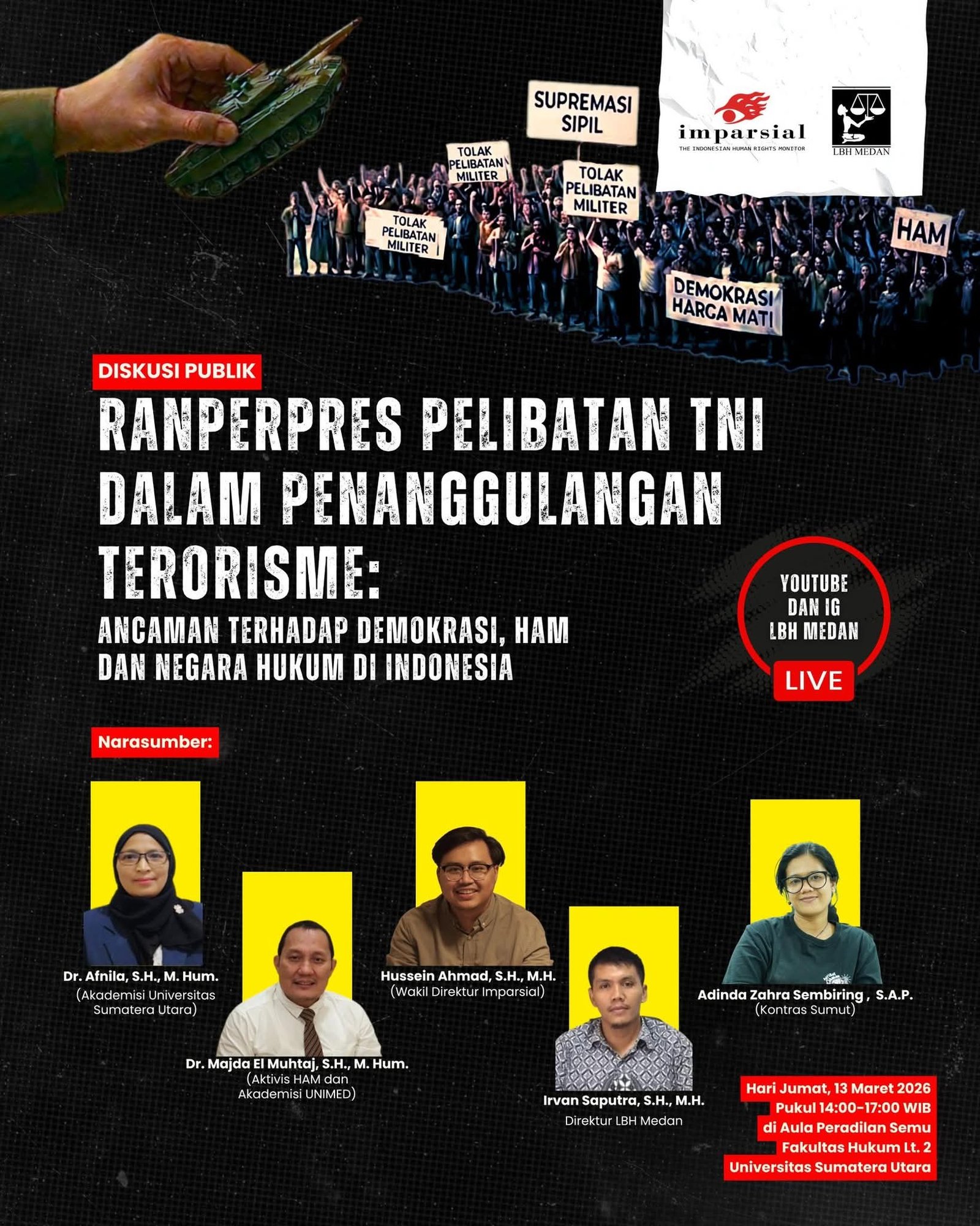 The Indonesian Human Rights Monitor (Imparsial) bersama Lembaga Bantuan Hukum (LBH) Medan menggandeng Akademisi dan Aktivis Hak Asasi Manusia (HAM) melaksanakan diskusi publik di Aula Peradilan Semu Fakultas Hukum Universitas Sumatera Utara. Membahas tentang “Ranperpres Perlibatan TNI dalam Penanggulangan Terorisme : Ancaman Terhadap Demokrasi, HAM, dan Negara Hukum di Indonesia.”, pada Jumat (13/03/2026).