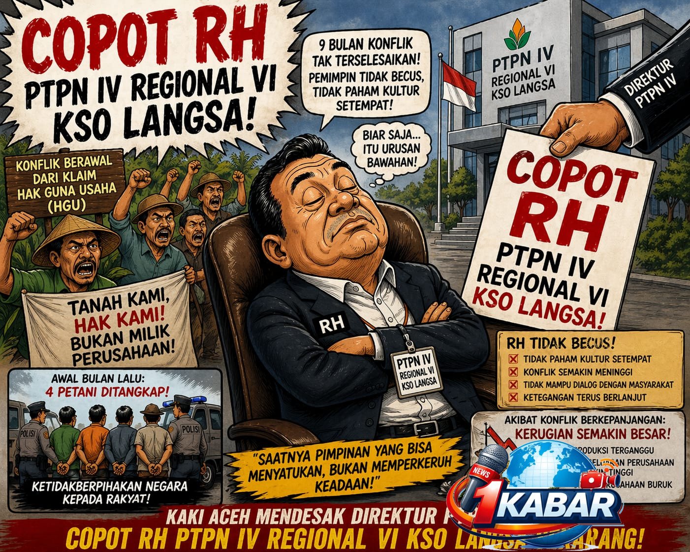 Banda Aceh | News1kabar.com — Komite Anti Korupsi Indonesia (KAKI) dan Ormas Brigade Anak Serdadu Provinsi Aceh mendesak manajemen PTPN IV untuk segera memberhentikan pimpinan Regional Head (RH) PTPN IV regional VI KSO Langsa berinisial YC. Desakan ini disampaikan menyusul konflik berkepanjangan antara perusahaan dengan masyarakat di wilayah Cot Girek yang dinilai tak kunjung terselesaikan.