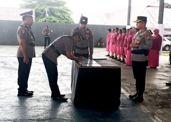 Kapolres Bitung AKBP Albert Zai memimpin langsung upacara serah terima jabatan (sertijab) sejumlah pejabat utama dan kapolsek di lingkungan Polres Bitung, Rabu (11/3/2026), di Asrama Polisi (Aspol) Kelurahan Pinokalan, Kecamatan Ranowulu.