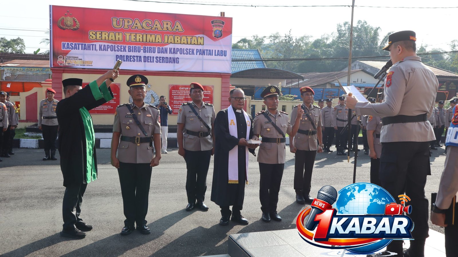 Upacara serah terima jabatan (Sertijab) dipimpin langsung oleh Kapolresta Deli Serdang, Kombes Pol. Hendria Lesmana, S.I.K., M.Si selaku Inspektur Upacara. Bertindak sebagai Perwira Upacara AKP. Hendri Ginting, S.H., M.H, dan Komandan Upacara IPDA. Abdi Siregar, S.H.
