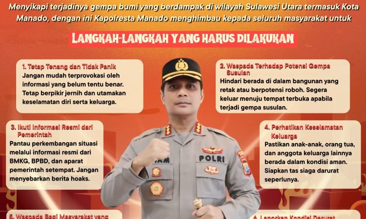 Pasca gempa bumi yang dirasakan di wilayah Sulawesi Utara, khususnya Kota Manado, Kapolresta Manado Kombes Pol Irham Halid menyampaikan imbauan penuh empati kepada masyarakat agar tetap tenang, tidak panik, serta mengutamakan keselamatan diri dan keluarga, Kamis (02/4/2026).Panduan Kota & Daerah