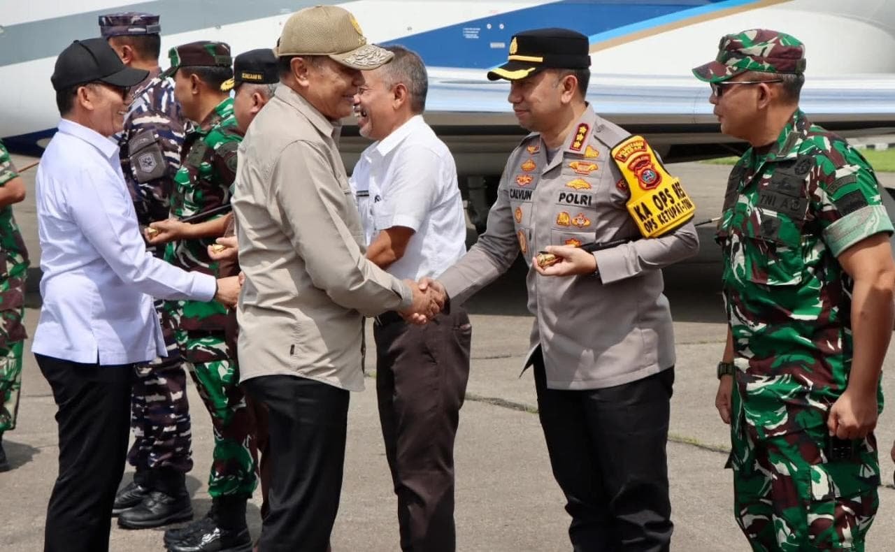 Kedatangan Menteri Koordinator Bidang Politik dan Keamanan Republik Indonesia (Menkopolkam RI), Djamari Chaniago disambut oleh Jajaran Forum Komunikasi Pimpinan Daerah (Forkopimda) Provinsi Sumatera Utara (Sumut) dalam suasana aman dan kondusif.