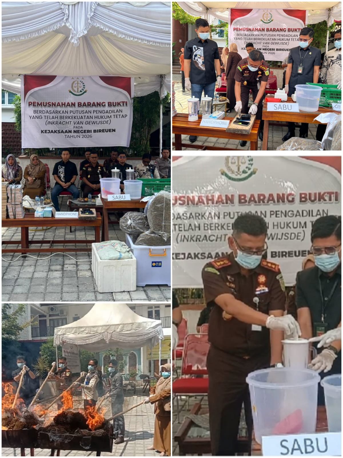 Pemusnahan tersebut merupakan pelaksanaan putusan pengadilan terhadap perkara tindak pidana umum yang ditangani Kejari Bireuen dalam kurun waktu Desember 2025 hingga Februari 2026.