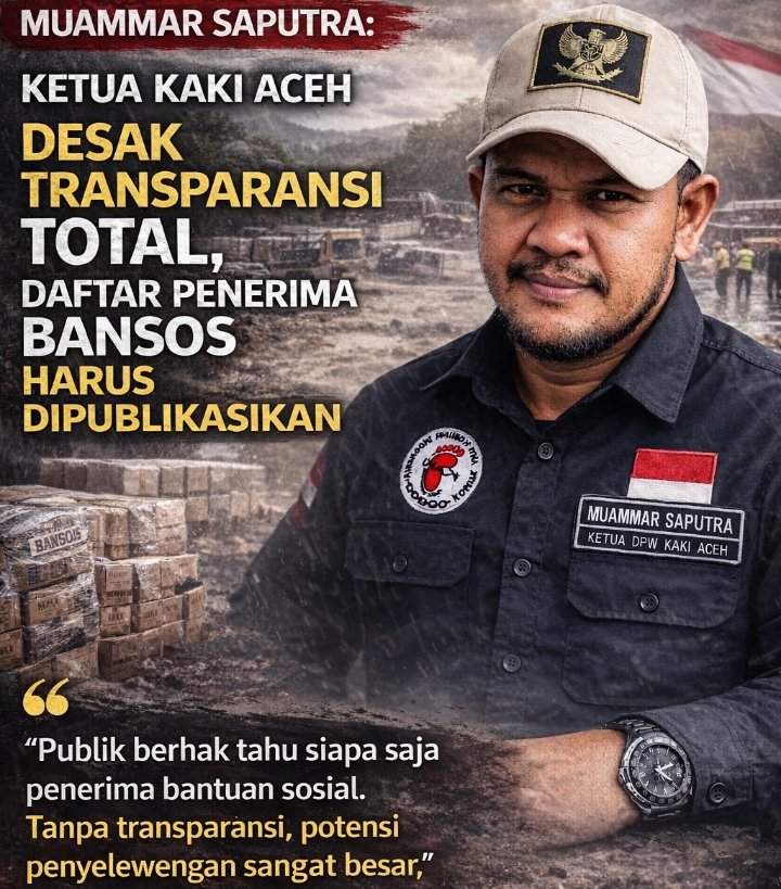 Ketua Komite Anti Korupsi Indonesia (KAKI) Aceh, Muammar Saputra, mendesak Dinas Sosial Aceh untuk secara terbuka mengumumkan daftar penerima bantuan sosial (bansos) tahun 2026 kepada publik. Langkah ini dinilai penting sebagai upaya menjamin transparansi serta mencegah potensi penyimpangan dalam penyaluran bantuan.