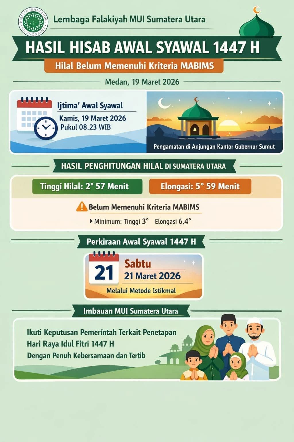 Dalam keterangan resmi Nomor A.003/LF-MUI SU/SR/III/2026 dijelaskan bahwa ijtima’ awal Syawal 1447 Hijriyah terjadi pada Kamis, 19 Maret 2026 sekira pukul 08.23 WIB.