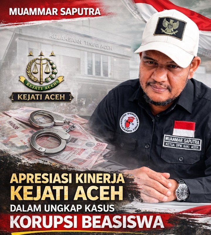 Ketua LSM KAKI Aceh, Muammar Saputra, menyampaikan apresiasi tinggi terhadap kinerja Kejaksaan Tinggi (Kejati) Aceh dalam mengungkap dan menindak kasus dugaan korupsi beasiswa yang menjadi perhatian publik. Apresiasi tersebut disampaikan menyusul langkah tegas Kejati Aceh yang telah menetapkan tersangka dalam kasus dugaan korupsi program beasiswa dengan nilai mencapai miliaran rupiah, serta langsung melakukan penahanan terhadap pihak yang diduga bertanggung jawab.