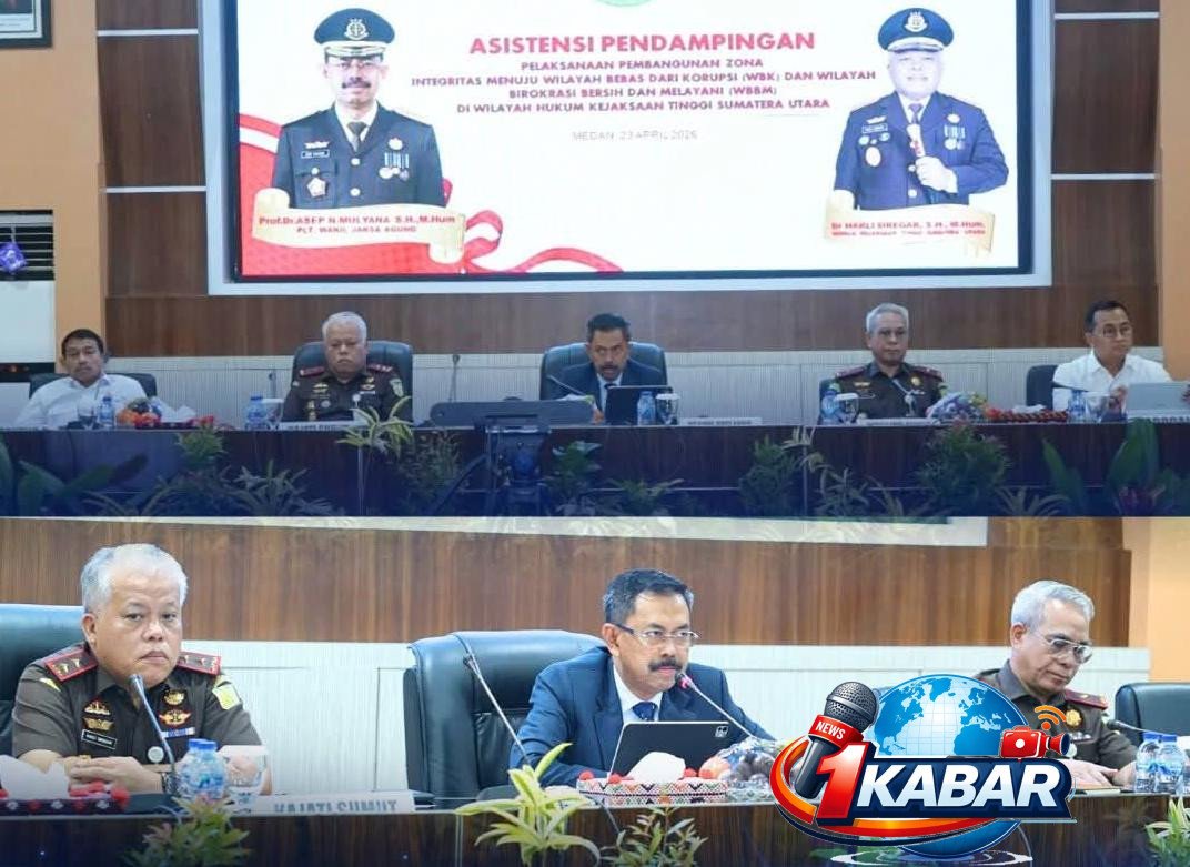 Pelaksana Tugas (Plt) Wakil Jaksa Agung Republik Indonesia, Prof. Dr. Asep N. Mulyana, S.H., M.Hum, Direktur B pada Jaksa Agung Muda Tindak Pidana Umum, Zullikar Tanjung, S.H., M.H, bersama Kepala Biro Perencanaan Kejaksaan Agung Republik Indonesia, Dr. Dwi Antoro, S.H., M.H, Kabag Reformasi Birokrasi, Gloria Sinuhaji, S.H.,M.H, beserta Tim melaksanakan giat asistensi pendampingan dalam rangka pelaksanaan pembangunan zona integritas menuju wilayah bebas dari korupsi (WBK) dan wilayah birokrasi bersih dan melayani (WBBM) pada Kejaksaan Tinggi Sumatera Utara (Kejati Sumut) yang berlangsung di Aula Cipta Kerta Lantai III, Jalan Jenderal Besar AH. Nasution Medan, pada Kamis (23/04/2026).