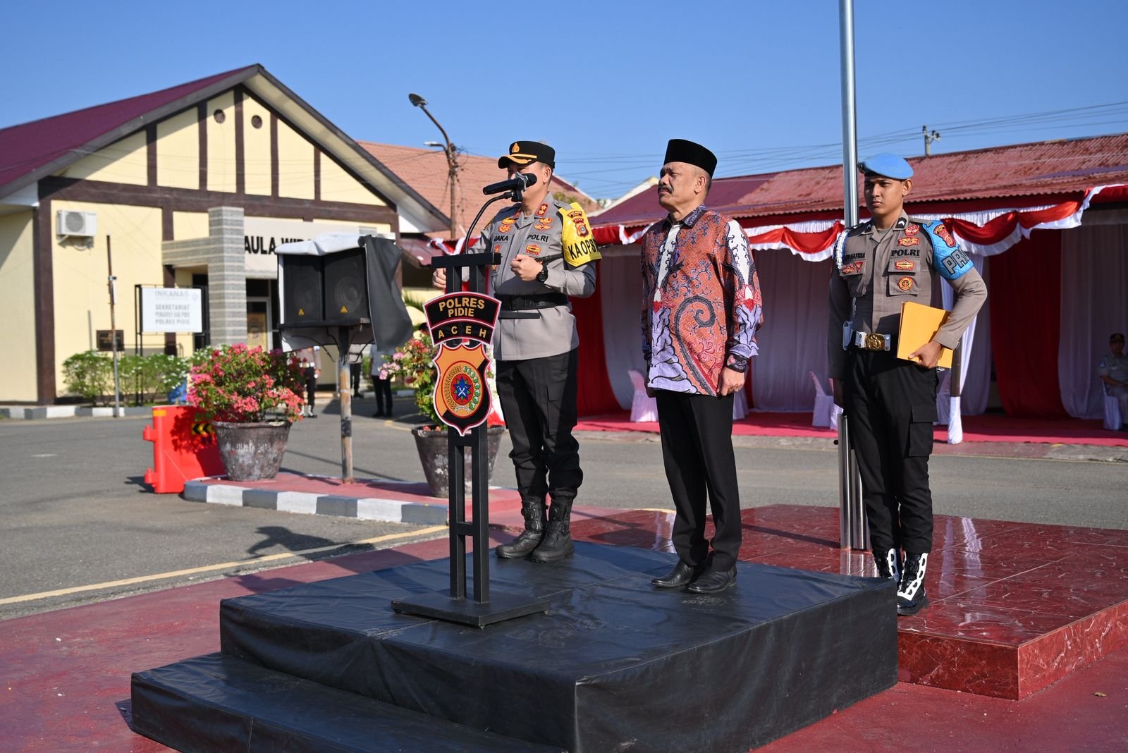 Turut hadir dalam kegiatan tersebut Bupati Pidie H. Sarjani Abdullah, SH bersama unsur Forkopimda Kabupaten Pidie, Wakapolres Pidie, para pejabat utama Polres Pidie serta para Kapolsek jajaran.