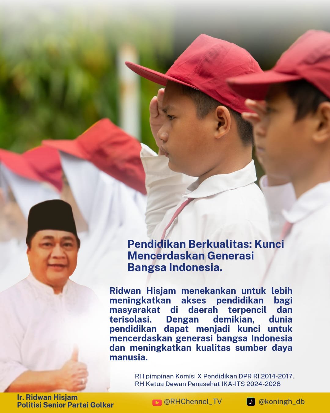 Ridwan Hisjam, atau yang akrab disapa Bung RH, merupakan salah satu figur penting dalam dunia politik Indonesia. Lebih dari tiga dekade, politisi senior Partai Golkar ini konsisten berkiprah di panggung nasional, menjadi saksi sekaligus pelaku dalam perjalanan panjang politik Indonesia—mulai dari era Orde Baru, masa reformasi, hingga dinamika politik modern pasca-pemilu langsung, dan juga RH pernah menjabat sebagai pimpinan Komisi X Pendidikan DPR RI 2014-2017, serta Ketua Dewan Penasehat IKA-ITS 2024-2028.