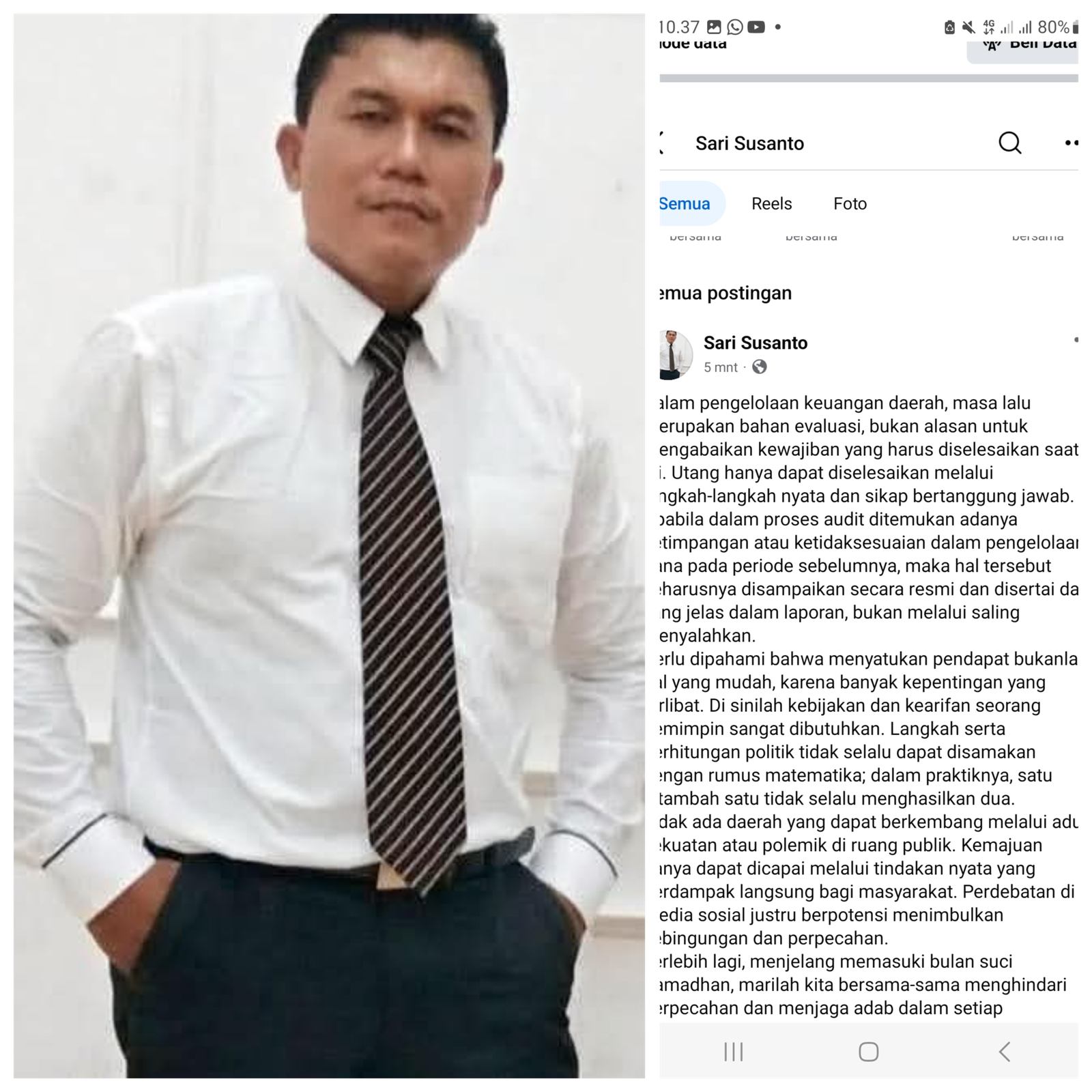 Subulussalam |news1kabar.com. Selasa (17/02/2026)— Di tengah memanasnya polemik pengelolaan keuangan daerah, Sari Susanto melalui akun Facebook pribadinya menyampaikan pesan tegas namun menyejukkan. Ia mengingatkan bahwa persoalan masa lalu seharusnya menjadi bahan evaluasi, bukan dijadikan alasan untuk menghindari tanggung jawab hari ini.