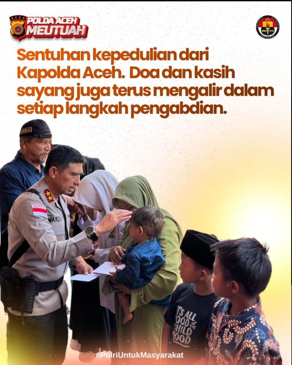 Kapolda Aceh menegaskan bahwa pengabdian Polri harus dilandasi rasa kasih sayang dan kepedulian. Menurutnya, keamanan dan ketertiban tidak hanya dibangun melalui aturan dan tindakan tegas, tetapi juga melalui sentuhan hati dan kedekatan dengan rakyat.